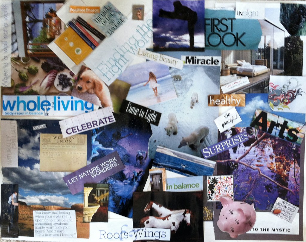 When you pause by an image or words, cut them out and collect them together without stopping to edit or evaluate. Once you have collected what seems like enough, sort through what you have collected and see how they fit together, how they want to sit on the page, where they are overlapping, what connects them and perhaps also what is missing. Glue them onto your paper and attend to what your intuition is telling you as you do this.